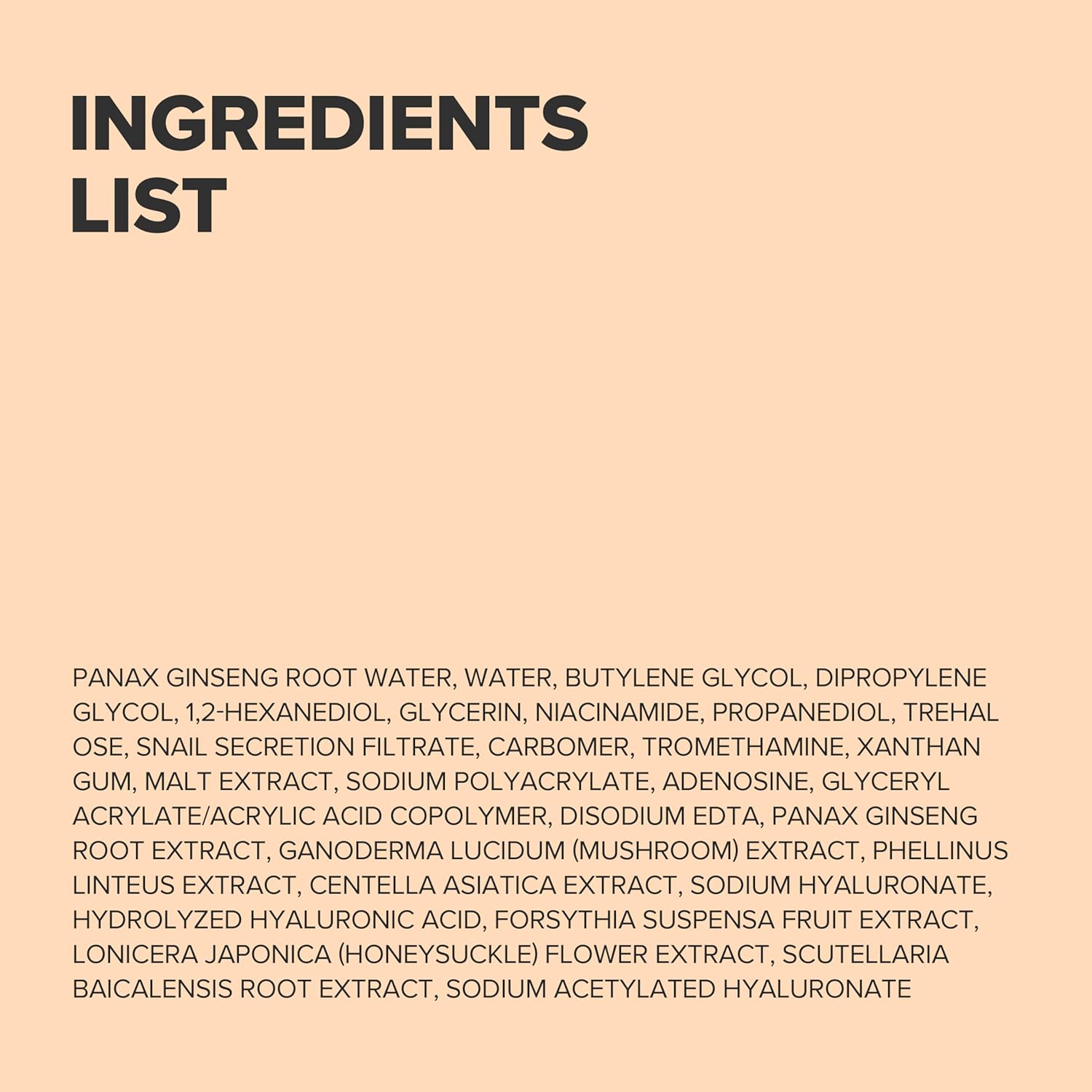 Panax Ginseng Root Water, Water, Butylene Glycol, Snail Secretion Filtrate, Dipropylene Glycol, 1,2-Hexanediol, Glycerin, Niacinamide, Propanediol, Trehalose Carbomer, Tromethamine, Xanthan Gum,Centella Asiatica Extract, Ganoderma Lucidum(Mushroom) Extract, Panax Ginseng Root Extract, Malt Extract, Sodium Polyacrylate, Adenosine, Glyceryl Acrylate/Acrylic Acid Copolymer, Disodium Edta, Phellinus Linteus Extract, Sodium Hyaluronate, Hydrolyzed Hyaluronic Acid, Forsythia Suspensa Fruit Extract, Lonicera Japonica(Honeysuckle)Flower Extract, Scutellaria Baicalensis Root Extract, Sodium Acetylated Hyaluronate