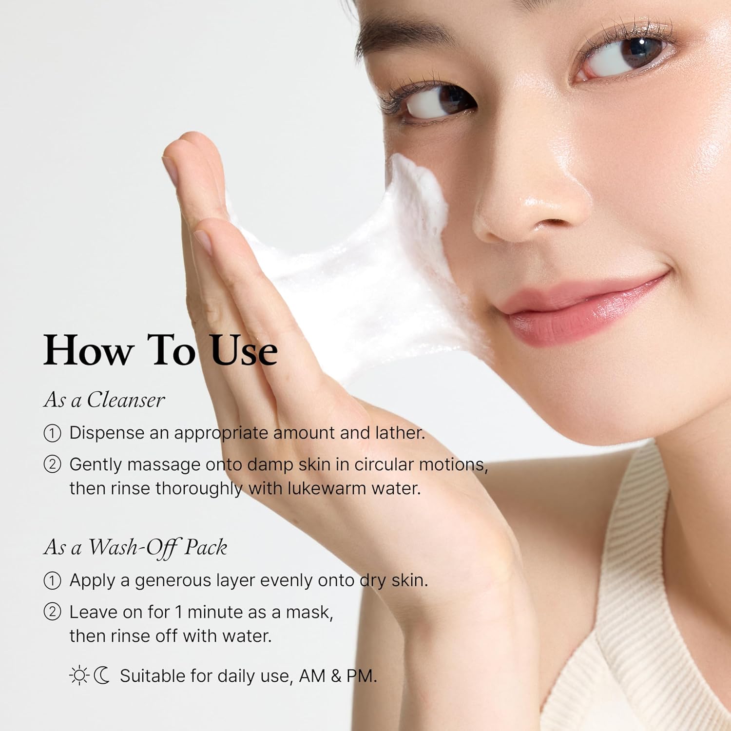 During cleansing, make lather to massage on wet face and rinse off.