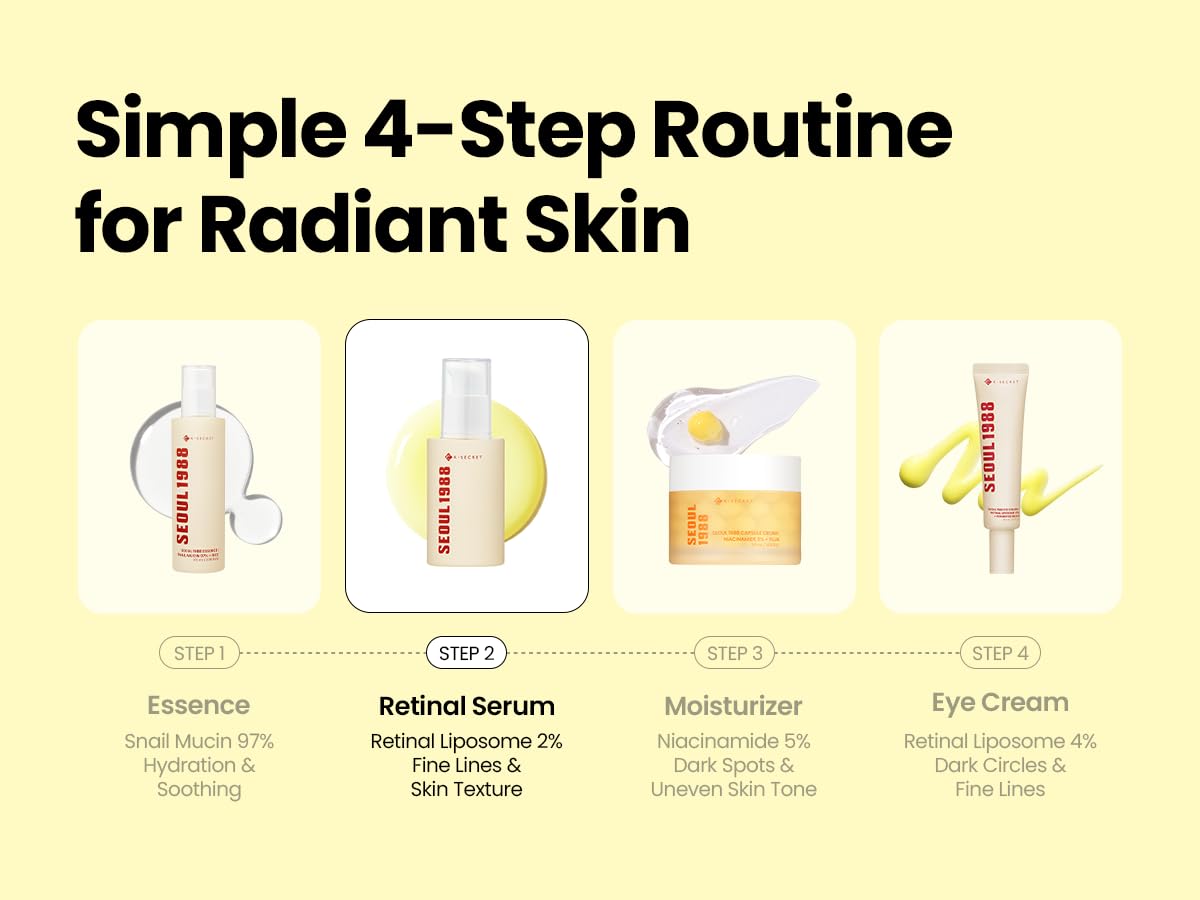 KSECRET SEOUL 1988 Serum : Retinal Liposome 2% + Black Ginseng is an anti-aging serum enriched with 2% Rentinal liposome and Black ginseng to promote a youthful, radiant complexion, while addressing skin texture, hydration, and the reduction of wrinkles. Retinal liposome helps to prevent skin aging, such as fine lines, wrinkles, uneven skin tone and skin texture. Black ginseng extract offers antioxidant benefits for skin protection. This serum is free of common allergens, harsh alcohols, fragrances, oils, parabens, sulfates, silicones, and artificial colors.